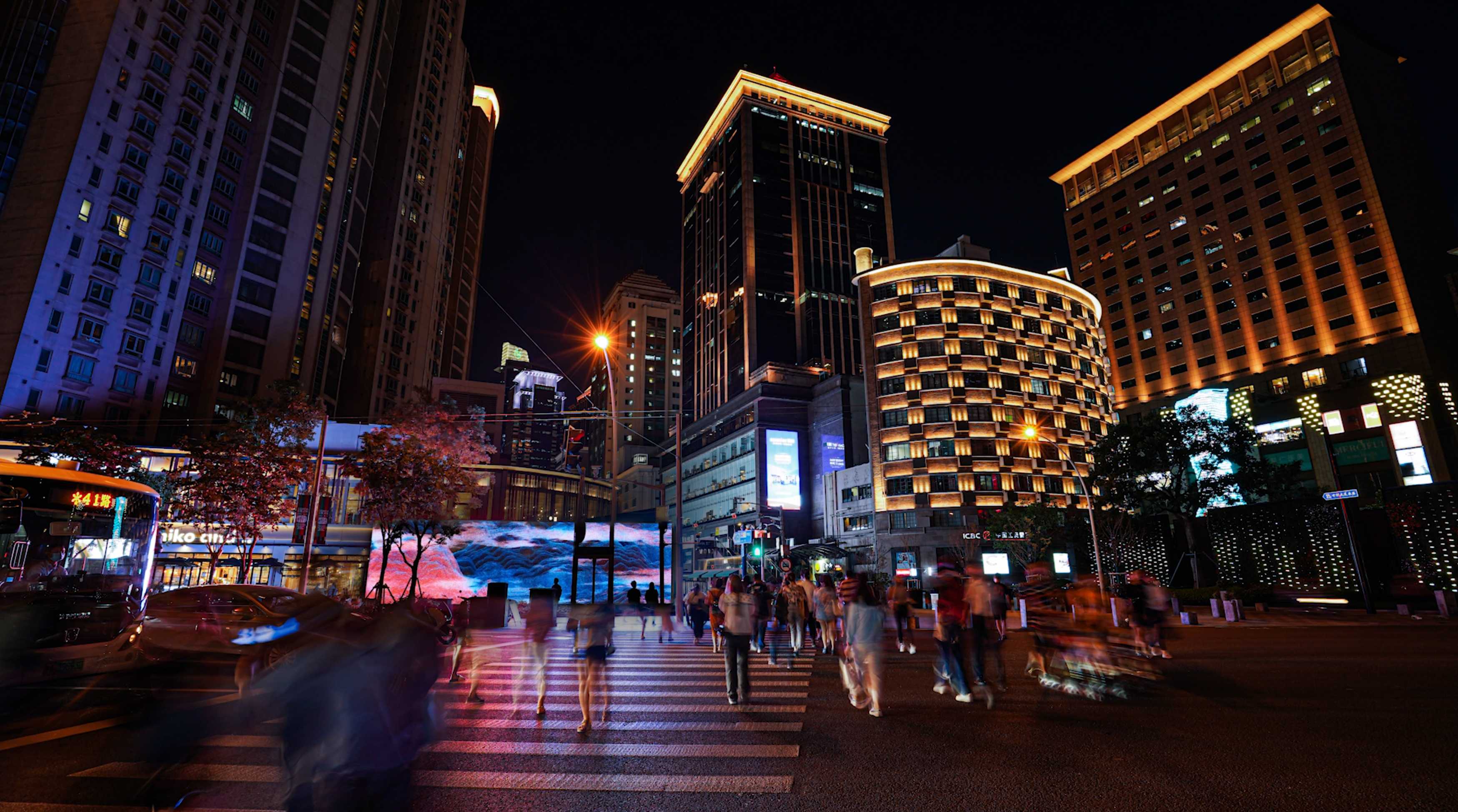 In collaboration with Poly Contemporary Art, Mountains & Rivers was exhibited on a large outdoor screen near Taikoo Hui in Shanghai.