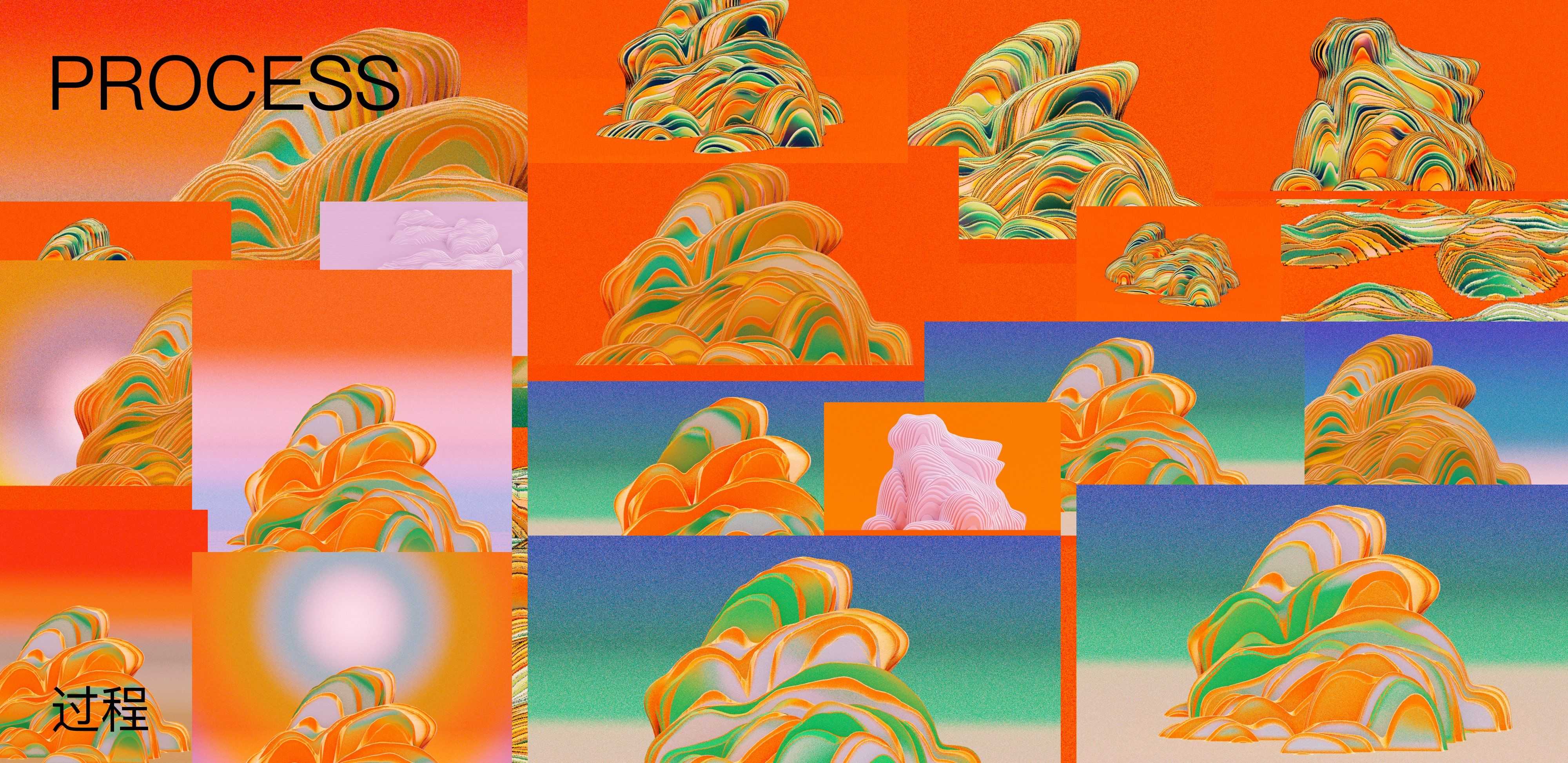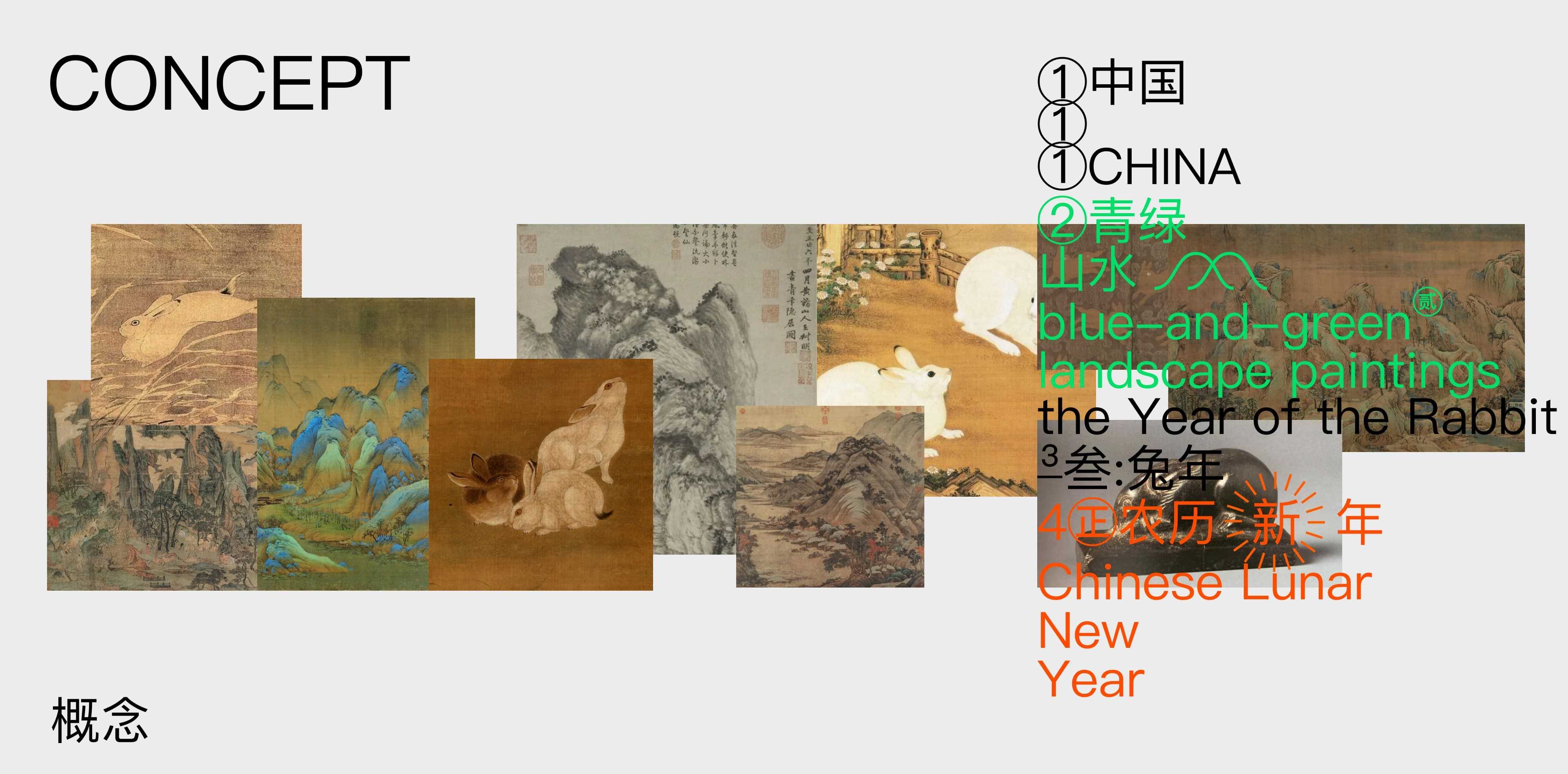 这次主视觉的概念是“新年归野”,意在致敬中国的传统文化以及品牌的运动精神。我以中国古代传统绘画中的兔子为基础,结合中国山水画中流畅有机的山的形态,再通过更动感配色和动画的形式来综合呈现,既富有中国传统韵味的同时,也不失现代新锐的视觉感受。